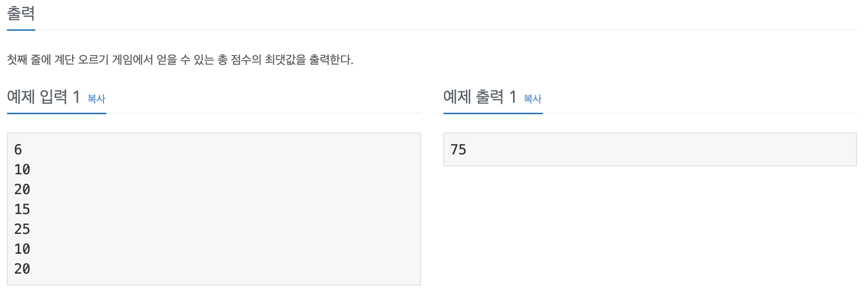 계단 오르기 게임은 계단 아래 시작점부터 계단 꼭대기에 위치한 도착점까지 가는 게임이다. <그림 1>과 같이 각각의 계단에는 일정한 점수가 쓰여 있는데 계단을 밟으면 그 계단에 쓰여 있는 점