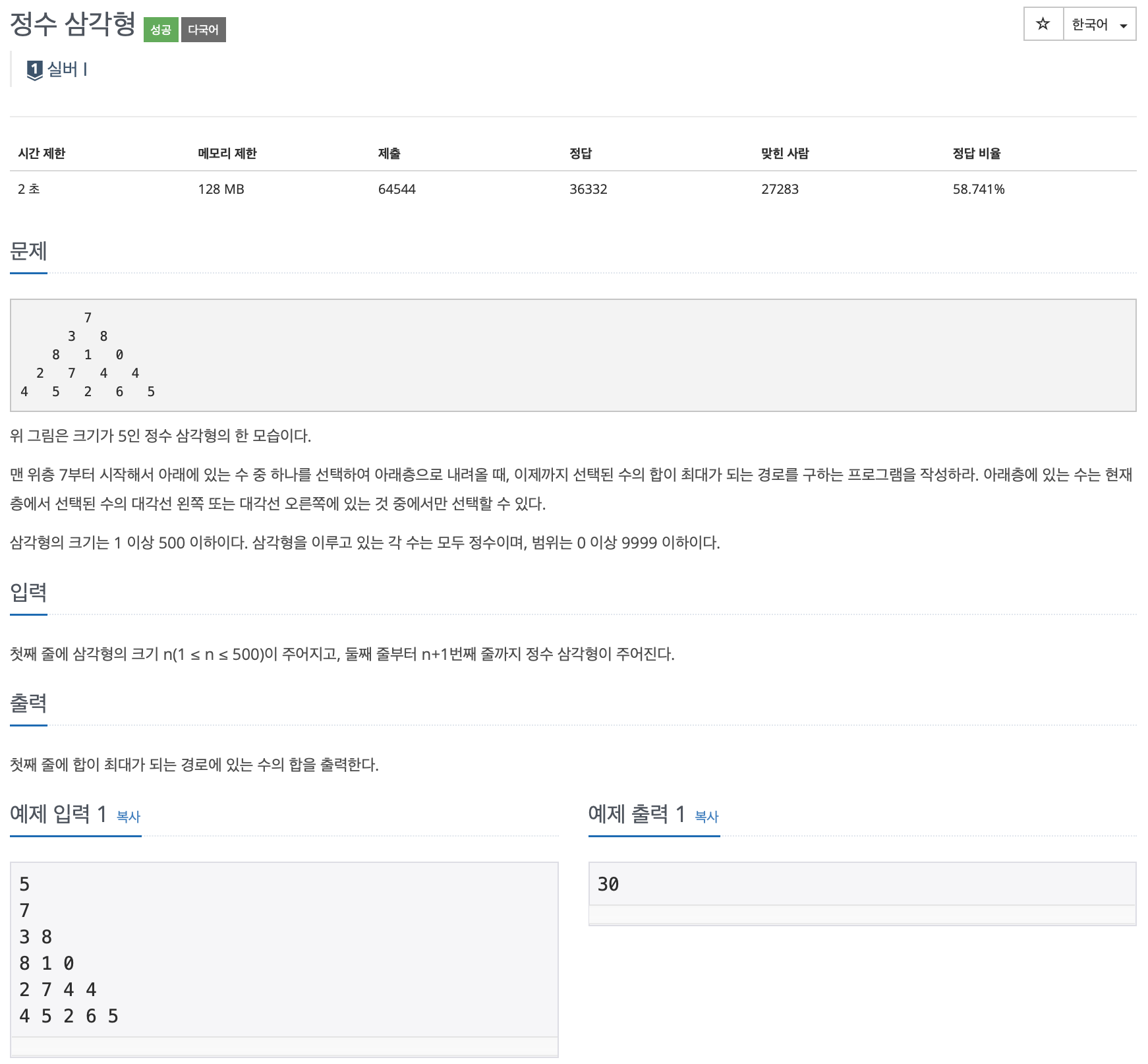 첫째 줄에 삼각형의 크기 n(1 ≤ n ≤ 500)이 주어지고, 둘째 줄부터 n+1번째 줄까지 정수 삼각형이 주어진다.