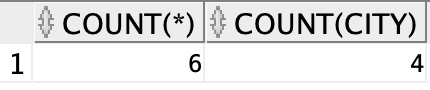 이렇게 생긴 테이블이 있는 경우, COUNT(*)과 COUNT(city)를 할 경우 밑과 같이 COUNT(*) = 6, COUNT(city) = 4가 나오게 된다.
