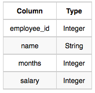 where employee_id is an employee's ID number, name is their name, monthsis the total number of months they've been working for the company, and salary is the their monthly salary.