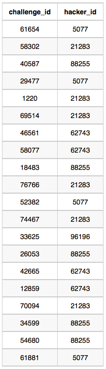 - Submissions: The submission_id is the id of the submission, hacker_id is the id of the hacker who made the submission, challenge_id is the id of the challenge for which the submission belongs to, and score is the score of the submission.