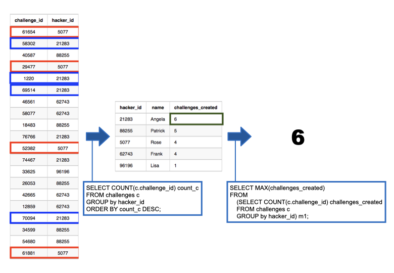 Julia asked her students to create some coding challenges. Write a query to print the hacker_id, name, and the total number of challenges created by each student. Sort your results by the total number of challenges in descending order. If more than one student created the same number of challenges, then sort the result by hacker_id. If more than one student created the same number of challenges and the count is less than the maximum number of challenges created, then exclude those students from the result.