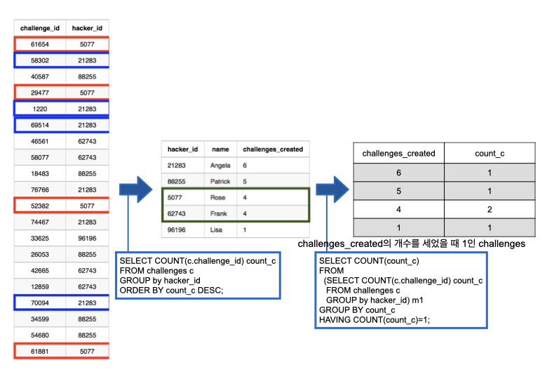 - 출력 : hacker_id,name,COUNT(hacker_id)-> hacker마다 몇번 시도했는지