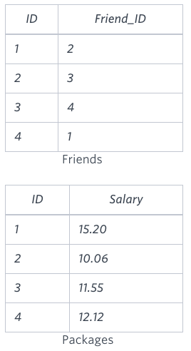 You are given three tables: Students, Friends and Packages. Students contains two columns: ID and Name. Friends contains two columns: ID and Friend_ID (ID of the ONLY best friend). Packages contains two columns: ID and Salary (offered salary in $ thousands per month).