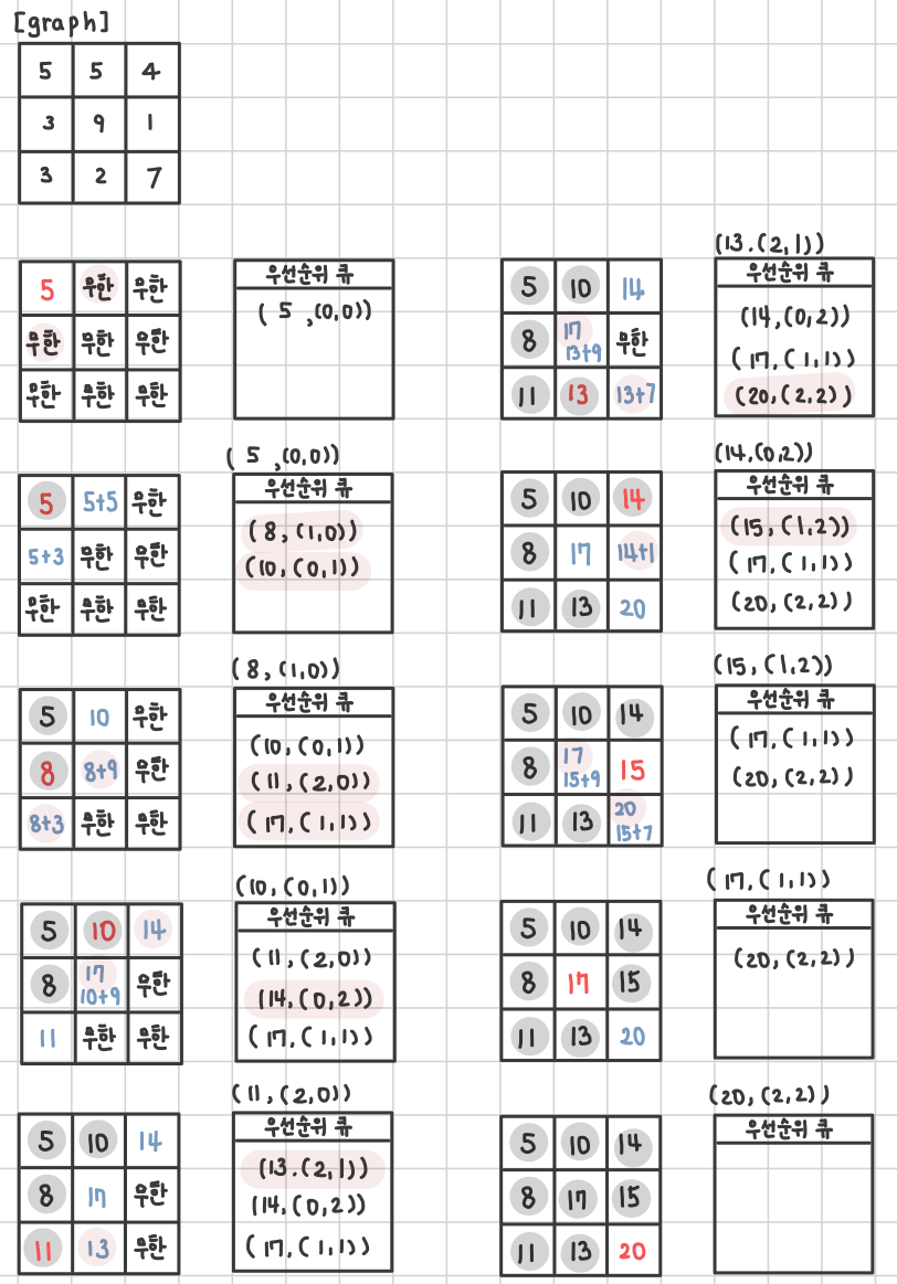 heapq.heappush(q, (graph[0][0], 0, 0)) # 시작점 추가
