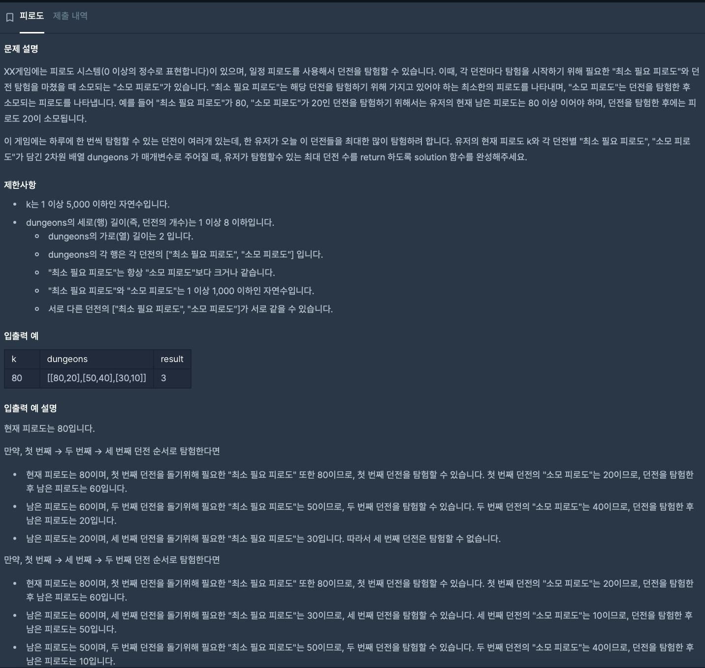 if k >= dungeons[elements[i]][0]: # 최소 필요 피로도를 만족하면 탐험 가능