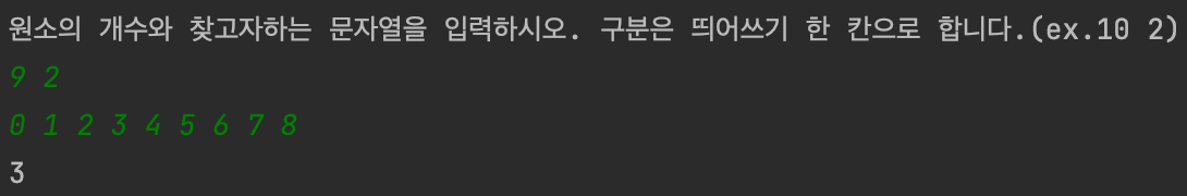 print("원소의 개수와 찾고자하는 문자열을 입력하시오. 구분은 띄어쓰기 한 칸으로 합니다.(ex.10 2)")